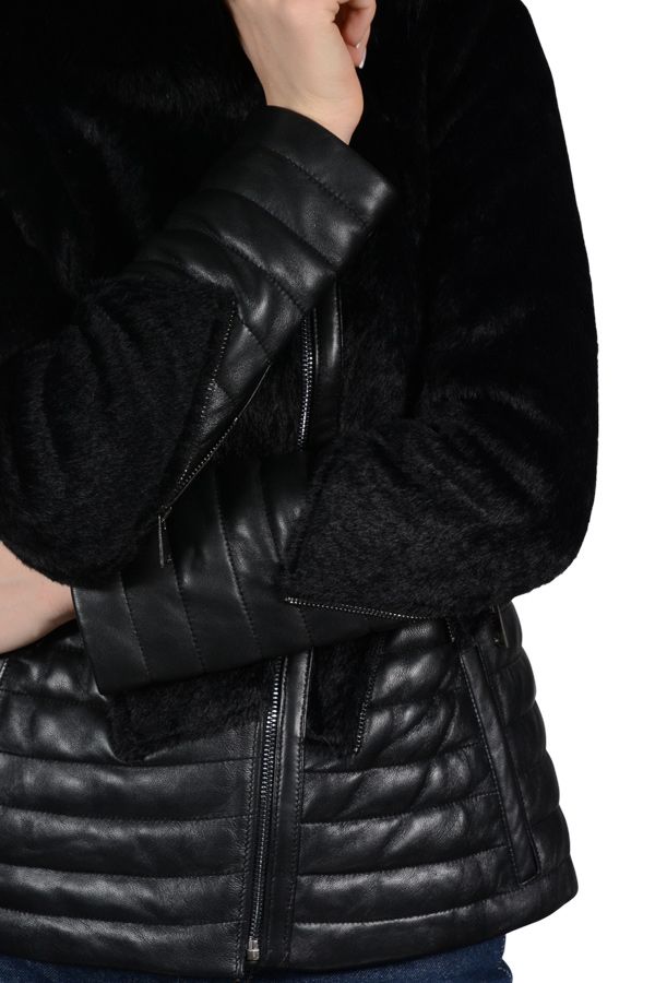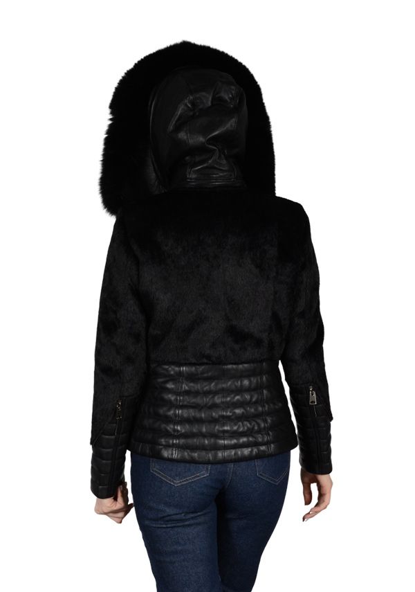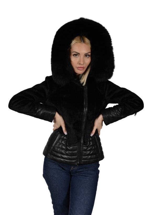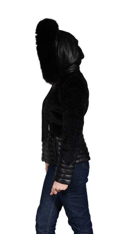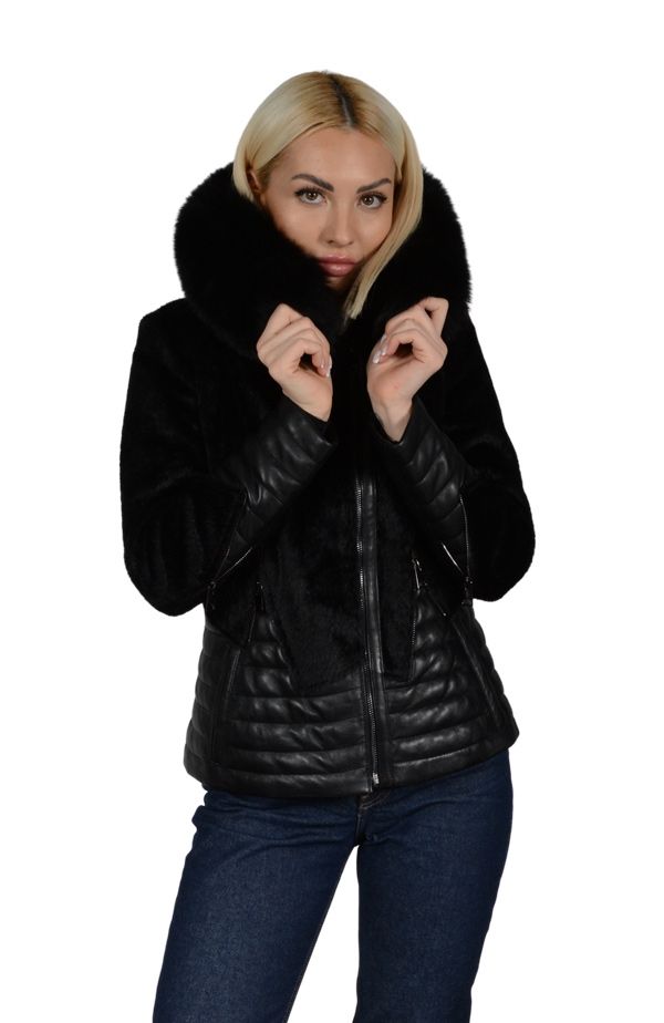 Дамско яке от агнешка кожа и плат Анкантър и качулка с пух от лисица